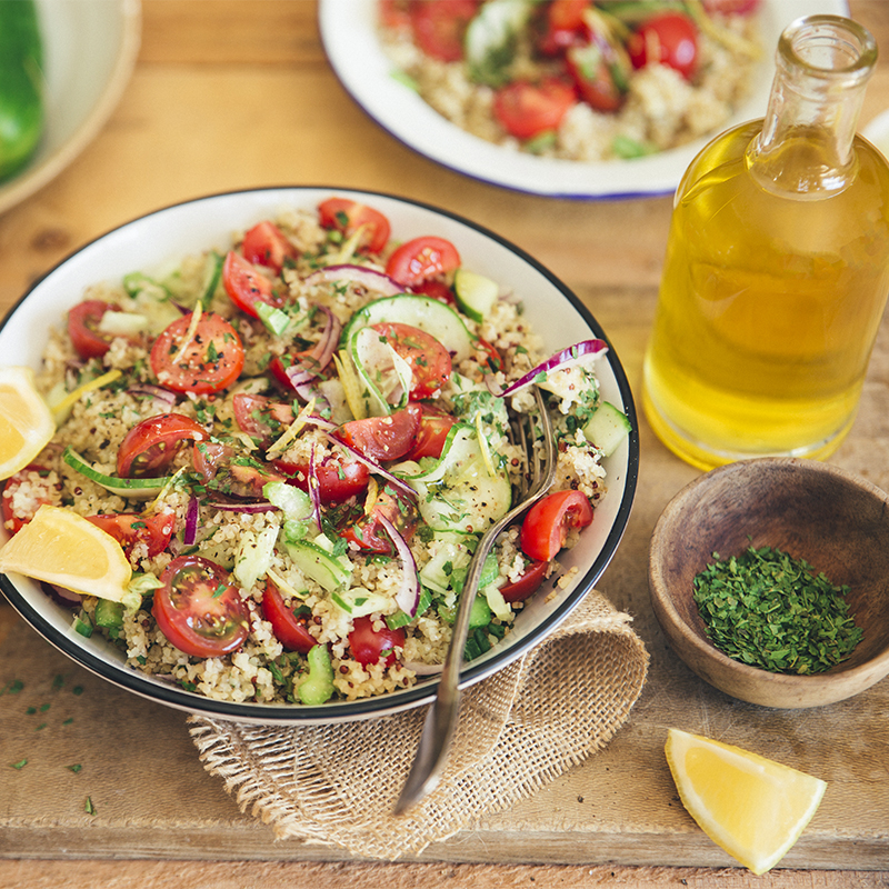-Una vez cocida, enjuague la quinoa con agua frÃa, escúrrala y vierta en una ensaladera. Añada el zumo de limón, la ralladura de limón, las hierbas y las verduras en cubos.
